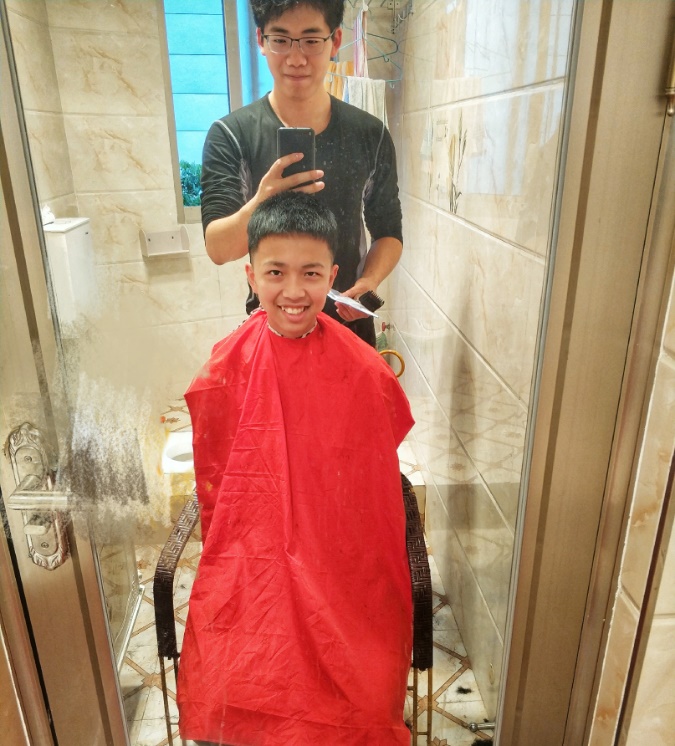 自新冠肺炎爆发以来,全国各地相继封城,隔离在家恍惚忘了今夕是何年。几个月没有接受Tony老师的洗礼,我弟眼看着即将进入“流星花园”状态,于是乎我伸出了救援的双手,一张椅子、一块围布、一把电推,一块理发海绵,“Tony蔡临时理发店” 就开张了。只见“Tony蔡”动作娴熟(生硬),电推在发际线的上下左右边缘疯狂试探,一小时不到,清爽的短寸就剪好了。“舒服”,“清爽”,“精神”,“Tony蔡”的技术得到了胞弟的认可!