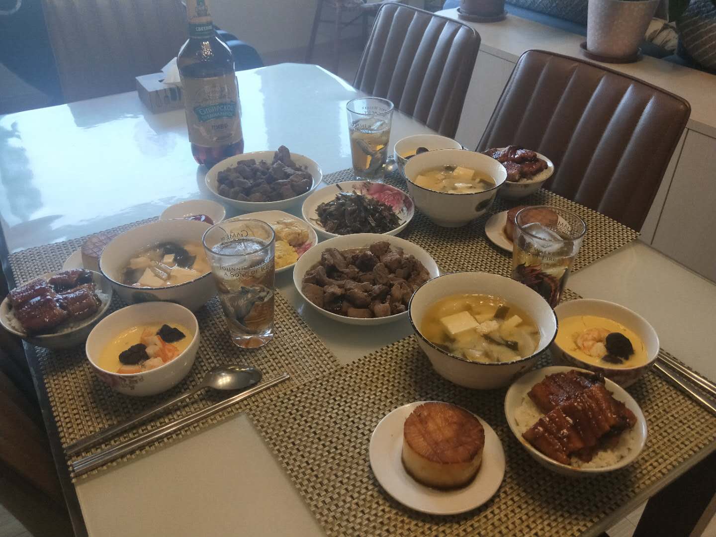 为家人做的一顿饭。提前一天查好食谱并做好笔记,当天下午开始准备做饭用的高汤,然后准备辅料和各种配菜,晚上在老爸的指导和辅助下开工,先是比较不怕凉的萝卜,萝卜煮熟淋上酱油两面煎一下;茶碗蒸将蛋液和高汤混合,过滤后放入各种配菜,上蒸锅;玉子烧做的并不成功,不太成型但是味道不错;味增汤加入味噌后加入豆腐海带等至水沸腾;鳗鱼用的现成的,微波一下就好。过程中用了特别多的碗,感谢老爸成为了一个无情的刷碗工具人。