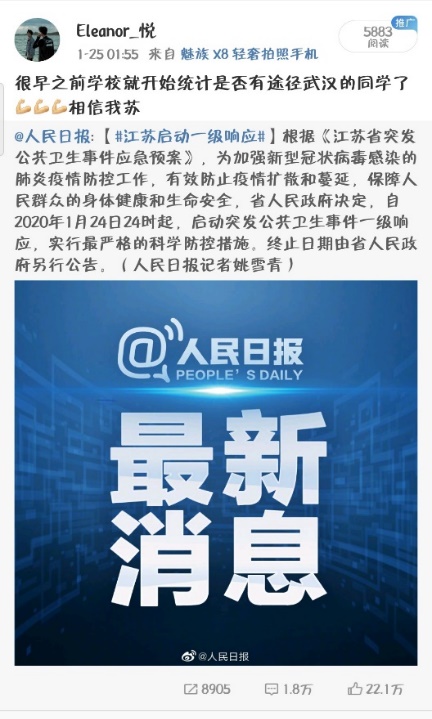 张强:在疫情期间,充斥着很多感人的事迹,但是我周边也有一些不和谐的情景,比如依然有四处散布某某谁湖北回来的,一家几口都感染了(其实并没有),前些日子四处上街玩耍到处传播病毒,然后在周围邻居间造成恐慌的。面对这些谣言,我时刻提醒家人不要轻易相信,要坚持看官方平台的信息,我给父母推荐了“盐城发布”、“扬子晚报”、“央视新网”、“人民日报”“环球时报”等地方和权威媒体的微信号,告诉他们相信这里的公告数据,不信谣不传谣。