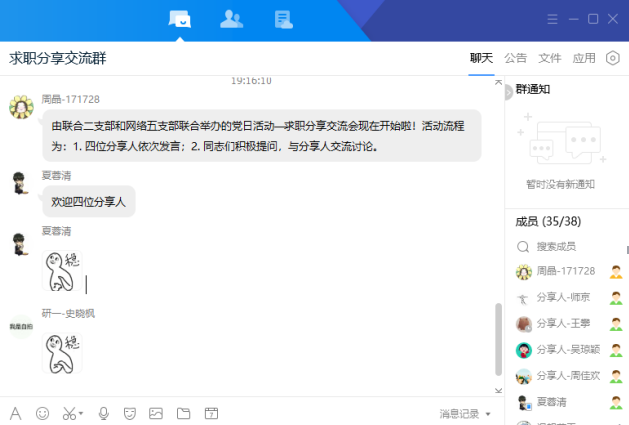 2018年5月16日晚7点,快猫 联合二支部与网络五支部共同举办了线上求职分享交流会。前期支部委员已经联系到18届毕业且拿到优秀Offer的学长学姐传授经验,并建立求职分享交流群。考虑到同志们的科研和工作比较忙,本次活动采用了QQ群交流方式,方便所有人获取求职经验,也可以让更多人加入到活动中来。