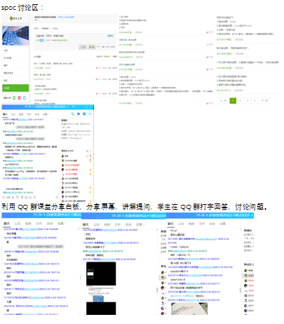课程采用异步spocQQ语音电话&屏幕分享。异步spoc用来看mooc视频,讨论区提问讨论;QQ群投票签到,答疑和发公告。上课时段网络状况较好。对于共性的问题和难点采用QQ语音电话&屏幕分享。边讲解边提问,学生通过QQ群打字回答。讲解时老师开启话筒,全员静音。除了采用屏幕共享外还用了白板共享,用鼠标写字效果不好,缺手写板和电子笔。课后也不断地有学生私信答疑。(见下图)