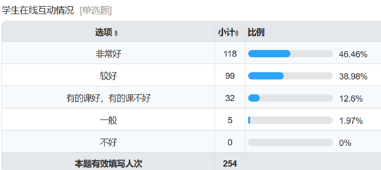 虽然在线教学不能面对面交流,但授课教师通过各种途径,也能促进师生互动,活跃课堂气氛。开展的线上交互方式也多种多样,包括线上测验、答疑讨论、作业布置、课堂提问、QQ群选择题投票、语音互动、抢答等。