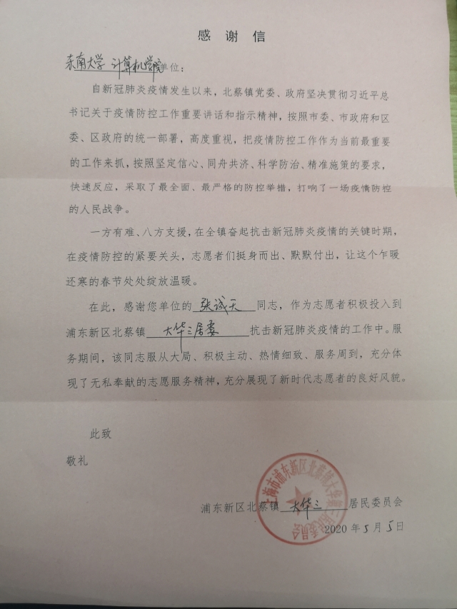 关于16级本科生张诚天同学参加“抗击新冠肺炎疫情”志愿者工作的感谢信