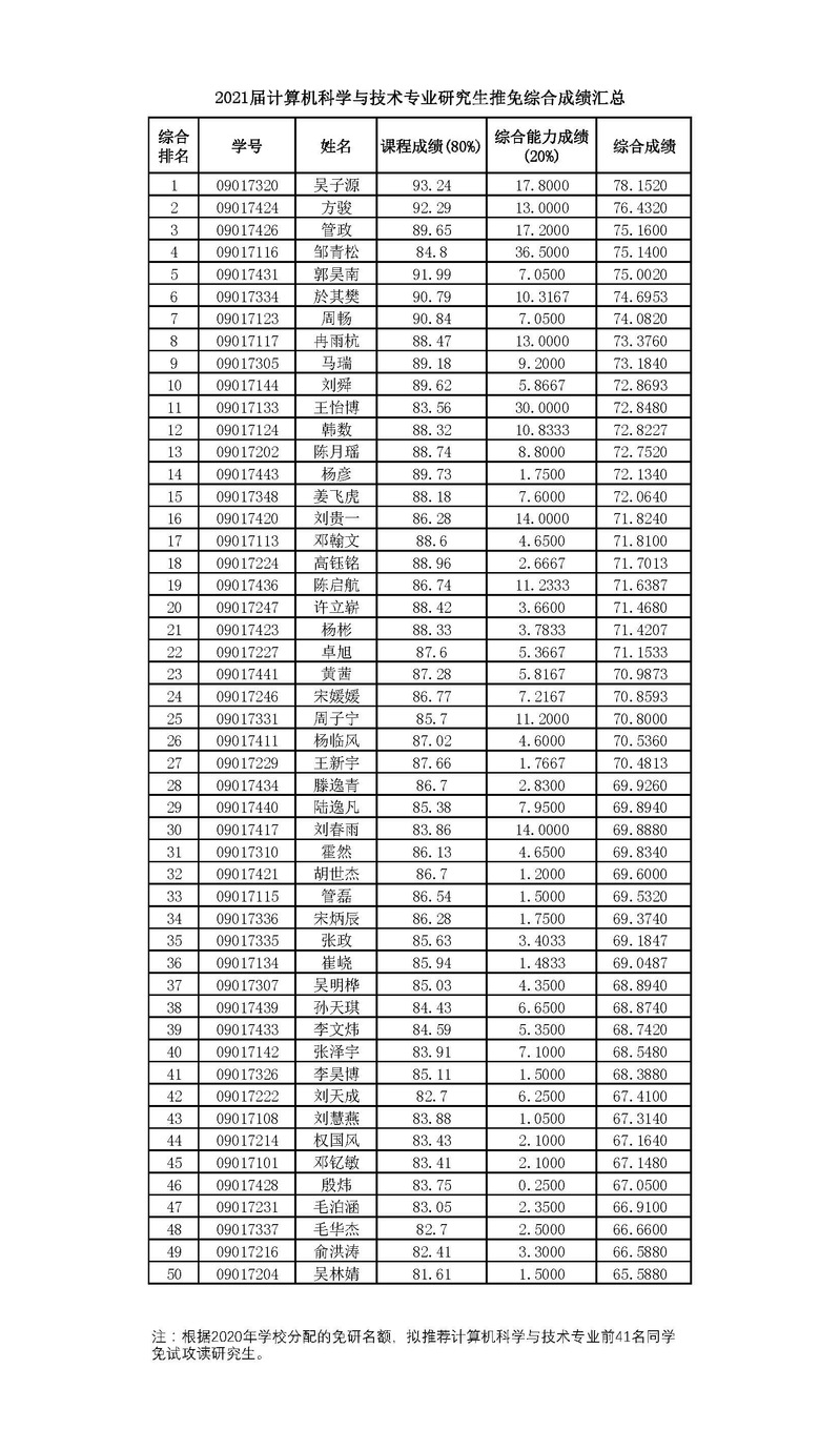 按照学院2021届免试研究生推荐细则,对申请参加免试研究生的同学进行考核。现对2021届计算机科学与技术专业研究生推免综合成绩进行公示。