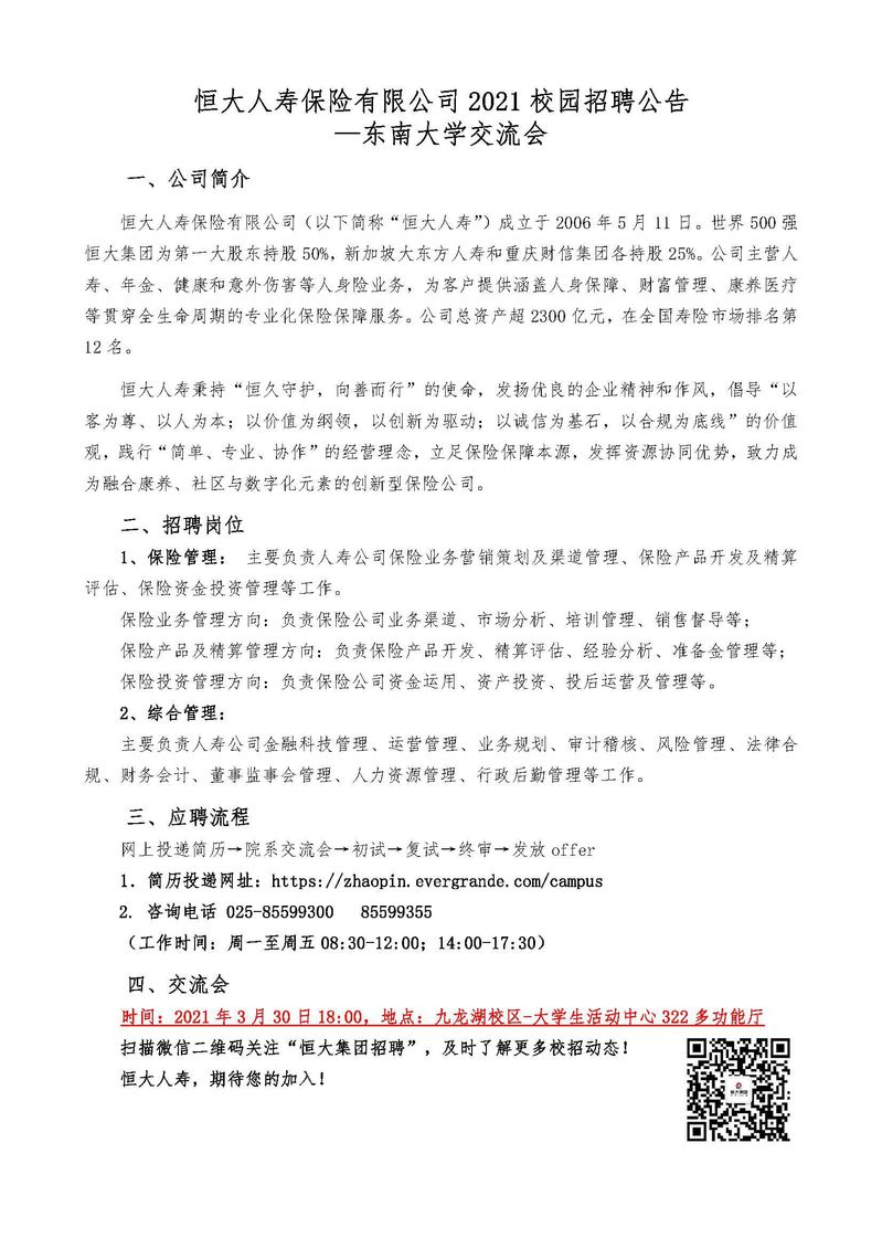 请有意向的同学们参加3月30日(周二)18:00在快猫 九龙湖校区大学生活动中心322多功能厅举办的宣讲会,同时扫描公告上的二维码进行简历投递,关注后进入校园招聘-简历投递-科技与保险-恒大人寿-选择岗位和地点进行投递。