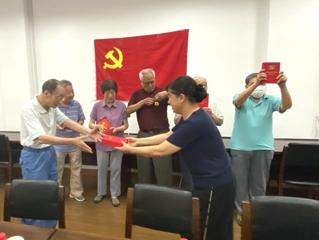 6月28日下午,快猫 、人工智能学院在四牌楼中心楼会议室举行了“光荣在党50年”纪念章颁发仪式。6名党龄满50年的老同志及退休支部党员代表参加了仪式,仪式由学院党委书记杨书记主持。