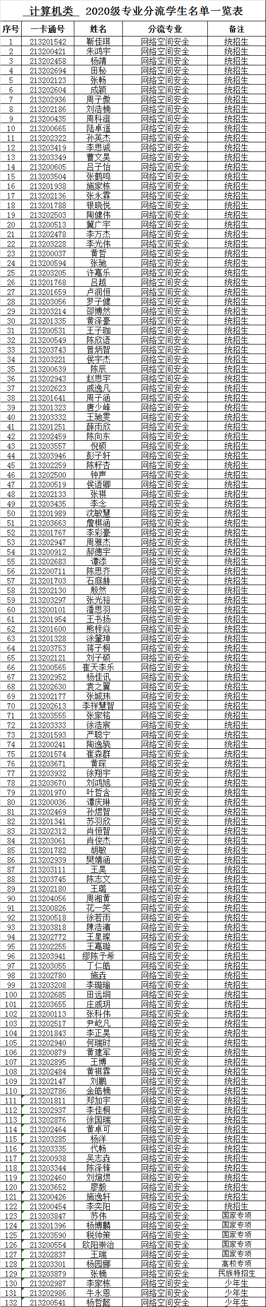 根据学校《关于2020 级部分本科生专业分流工作安排的通知》(校机教〔2021〕75号)文件精神,根据学生填报志愿,按照计算机类分流方案,确定各专业学生名单。现对计算机类各专业分流名单进行公示。
