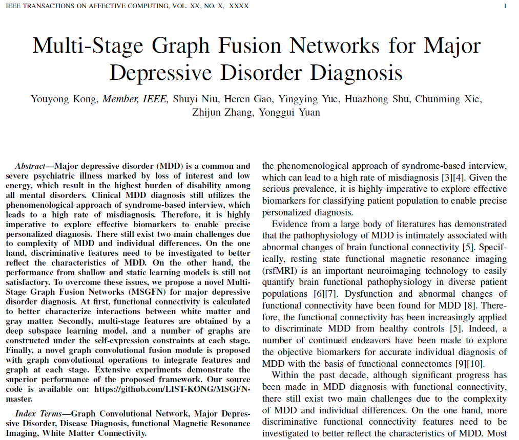 附属中大医院心身医学科主任袁勇贵团队医工交叉结合,首次开展了基于白质功能类连接的抑郁症智能诊断方法的研究,相关成果以“多阶段图融合网络在抑郁症诊断中的应用”(Multi-Stage Graph Fusion Networks for Major Depressive Disorder Diagnosis)为题在情感计算顶级期刊《情感计算汇刊》(IEEE Transactions on Affective Computing,IF=13.99)发表。