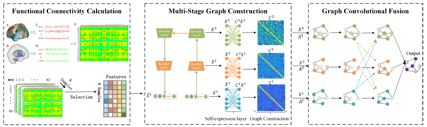 为了解决这个问题,快猫 孔佑勇老师和袁勇贵团队持续合作,以白质功能连接作为特征,提出了一种多阶段图融合的抑郁症诊断方法,实现抑郁症的智能诊断。该工作巧妙地利用了新型白质功能连接特征描述个体;针对现有原始特征空间表示单一,通过多阶段特征可以实现信息互补,子空间数据的自我表达自适应地构图;进一步针对多图进行融合,采用图卷积进行抑郁症诊断。该研究对于抑郁症智能诊断和其他脑疾病诊断具有重要意义。