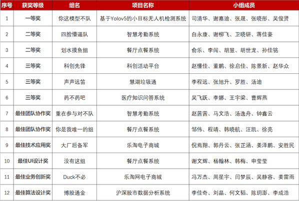 根据各项目小组平时表现和成果汇报情况,此次项目实训共评选出一等奖1个、二等奖2个、三等奖3个、特色奖6个,由评委老师进行现场颁奖。