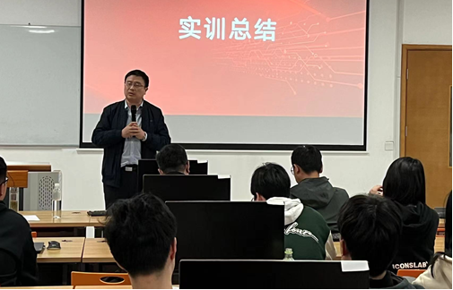 李伟进行总结发言,他首先对中国高科集团对快猫 人才培养的一贯支持、尤其是对此次现场施训的荆明明、祝铁芳、肖莉娟三位企业老师的辛勤付出表示衷心感谢,对经历5周连续奋战、顺利完成项目实训的同学们表示祝贺。他指出,此次项目实训呈现出三个特点,一是项目实训整体完成度高、效果好,二是学生的算法应用能力较强,三是女生的技术能力较为突出。他希望同学们能够将此次实训结束作为新的起点,对已完成的实训项目继续打磨、优化、完善,在接下来的专业实践环节,进一步提升自己的工程实践能力、科研创新能力和团队协作能力,成长为新时代高素质、强本领的软件工程高层次创新型人才。