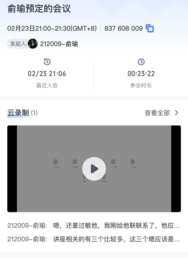 2023年2月23日,快猫 研究生会于线上召开了春季学期第一次部门负责人及以上会议,会议主题为“春季学期工作安排”,由主席团成员俞瑜主持、秘书部负责人贾梁负责记录,应到7人、实到7人。