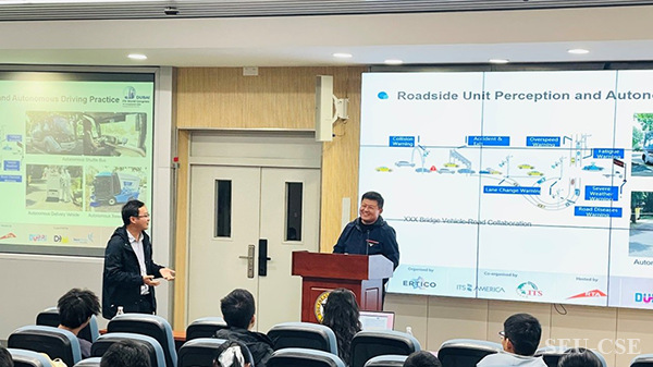 周翔首先介绍了全球智能驾驶领域的发展现状,引入智能网联汽车“车-路-云集成”的概念,并指出中国在智能网联汽车领域的规划以及遇到的挑战。随后,通过车路云一体化系统,详细介绍了智能网联汽车领域的关键技术,包括自动驾驶系统、多传感器融合感知、数据融合、路侧单元感知与V2X通信等。还结合大桥车路协同案例,为同学们演示了不同场景下自动驾驶的实现过程,并借此分析各应用当前存在的能力瓶颈,进行了应用展望,指出智能驾驶将成为未来人们主要的出行方式。最后,他还结合自己的求学经历、创业经历,分享了从科研到创业一路的人生感悟,鼓励在校学生把握青春时光不断充实自己,并为想要创业的学生提供经验之谈。通过此次课外研学讲座,不仅进一步加强了学校与校友之间的交流,拉近了校友与母校的情感,还帮助同学们了解了智能驾驶的发展趋势与关键技术,掌握计算机行业前沿知识。