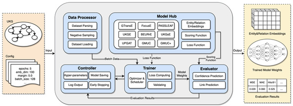 发表在SIGIR2024上的论文 “unKR: A Python Library for Uncertain Knowledge Graph Reasoning by Representation Learning”的通讯作者为吴天星副教授,第一作者为其指导的硕士研究生王靖婷。论文发布了国际首个专注于不确定性知识图谱推理的开源工具unKR(//github.com/seucoin/unKR)。它使用一套统一的框架(如图3所示)复现了9种广受认可的不确定性知识图谱表示学习与推理模型,通过模块化架构设计提供自定义功能,使得研究人员和开发者能够灵活地调整、优化、开发模型,以适应特定的应用场景或研究需求,并面向多个基准数据集构建统一的评估体系,展现了优异的兼容性与扩展性。此外,该工作设计用于置信度预测与链接预测的提示并在开源大模型上做了参数高效微调,实验发现微调后的大模型具备在不确定性知识图谱上执行推理的能力,在特定数据集上能够获得最先进的效果。未来基于大模型技术进一步提升现实场景的不确定性知识图谱推理能力是知识推理研究的重要方向。