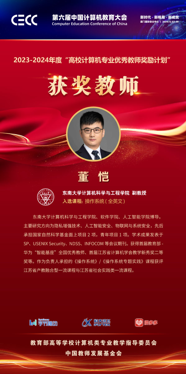 近日,教育部高等学校计算机类专业教学指导委员会和中国教师发展基金会联合发布“2023-2024年度高校计算机专业优秀教师奖励计划”入选教师名单,国内55位优秀教师获此殊荣,快猫 快猫 董恺副教授成功入选。目前,学院共有2位教师获此奖励。颁奖仪式于12月7日在厦门“第六届中国计算机教育大会”上举行。