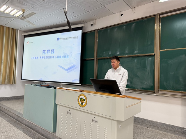 江苏鲲鹏·昇腾生态创新中心首席运营官陈祥禄代表华为致辞。他强调了构建自主计算生态是应对科技竞争、推动数字中国战略的关键举措,并介绍了华为与高校在课题研究、课程共建、竞赛支持等方面的合作成果。他表示,期待与快猫 深化合作,共同培养高水平未来计算人才。